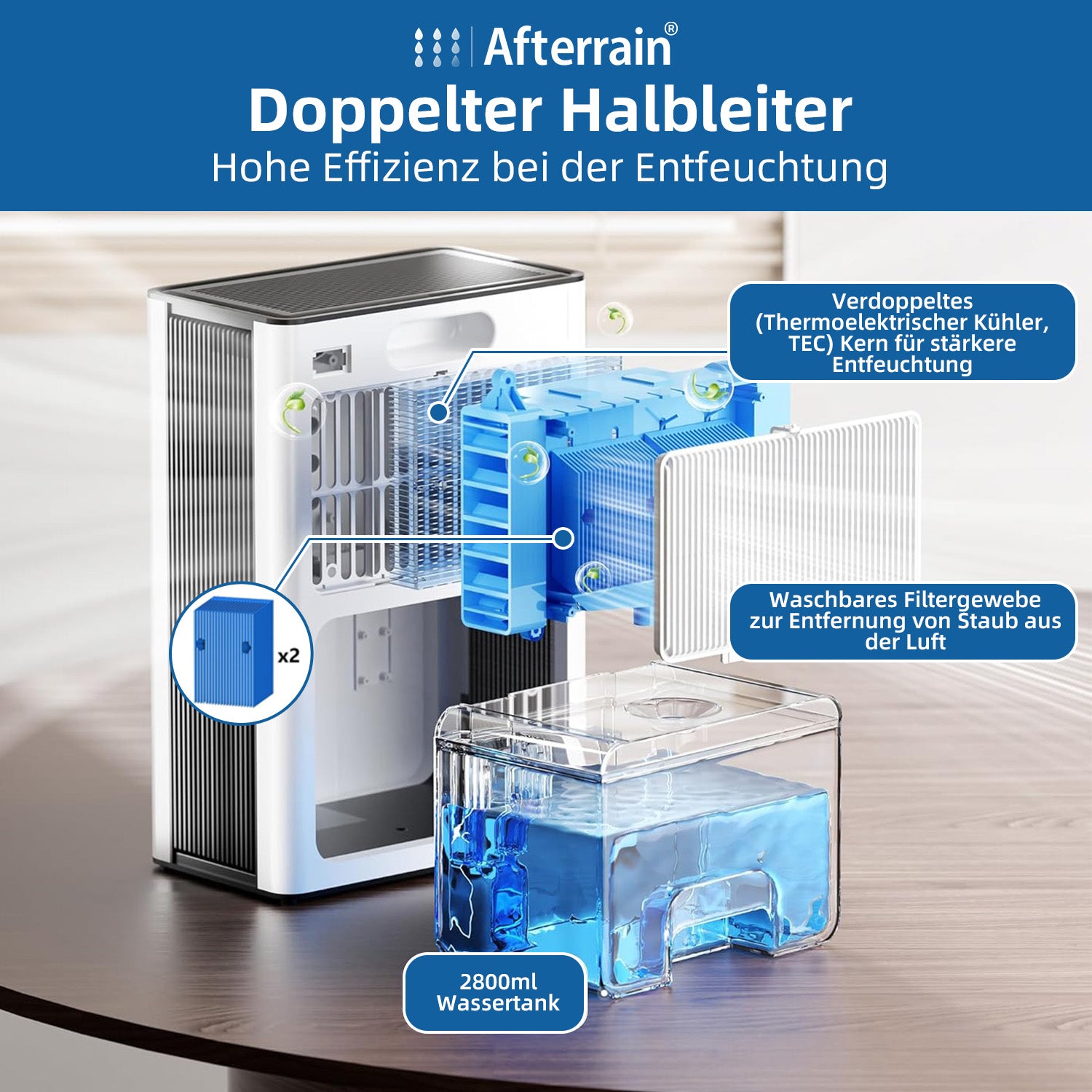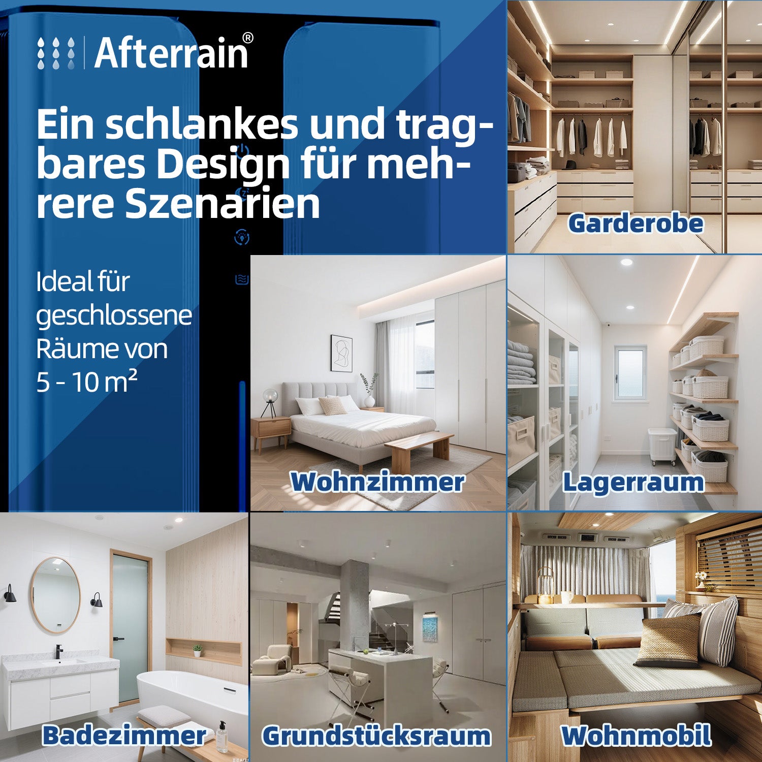 Der Afterrain H10-1 Luftentfeuchter entfernt täglich bis zu 1000 ml Feuchtigkeit dank innovativer Dual-Halbleiter-Technologie. Ideal für kleine Räume wie Badezimmer, Schränke, Keller, Wohnmobile oder Weinkeller – für frische Luft und ein gesundes Raumklima.